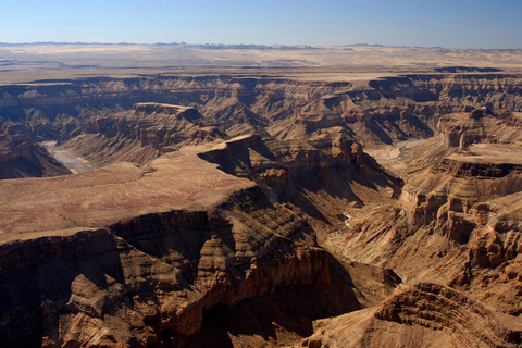 Grande journée de découverte de cette région. En fonction de vos envies, petites randonnées à travers des paysages grandioses. Né de l'activité des plaques tectoniques et de l'érosion, le Fish River Canyon se situe dans le Karas, au sud, région la moins peuplée du territoire namibien. Deuxième plus grand canyon au monde après celui du Colorado, ses 160 km de long, 27 km de large et 550 mètres de profondeur offrent des panoramas impressionnants. Traversé occasionnellement par la Fish River, il est bordé à l'ouest par le désert du Namib et à l'est par le désert du Kalahari.
